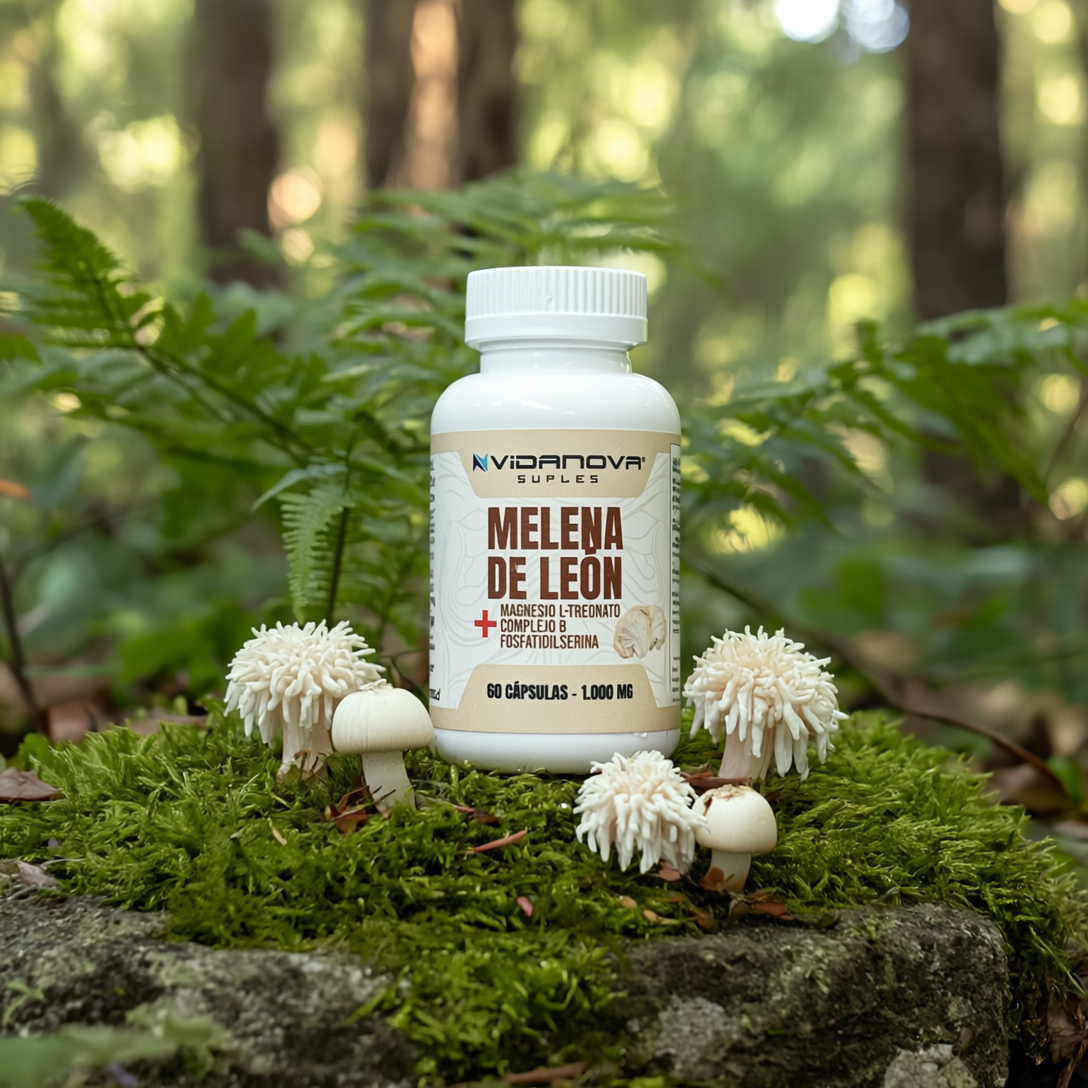 La melena de león (Hericium erinaceus) es un hongo tradicionalmente usado para apoyar la salud cerebral y nerviosa. Esta fórmula VIDANOVA combina melena de león con L-treonato de magnesio, Complejo B y fosfatidilserina, para un soporte integral pensado en mente, enfoque y bienestar general.
